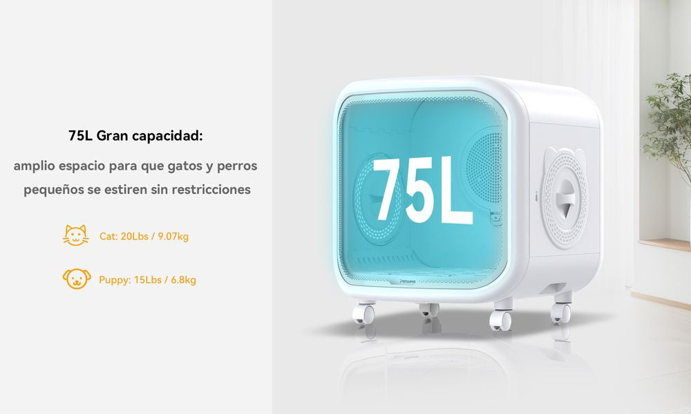 The MX0187 Pet Dryer Box offers a safe, gentle, and efficient solution to dry your pet after a bath. This spacious 75-liter cabin provides a comfortable, enclosed space where your dog or cat can relax while being dried with warm, circulating air. The innovative smartphone app control via WiFi or Bluetooth allows you to monitor and adjust settings remotely, making the drying process easier for both you and your pet.